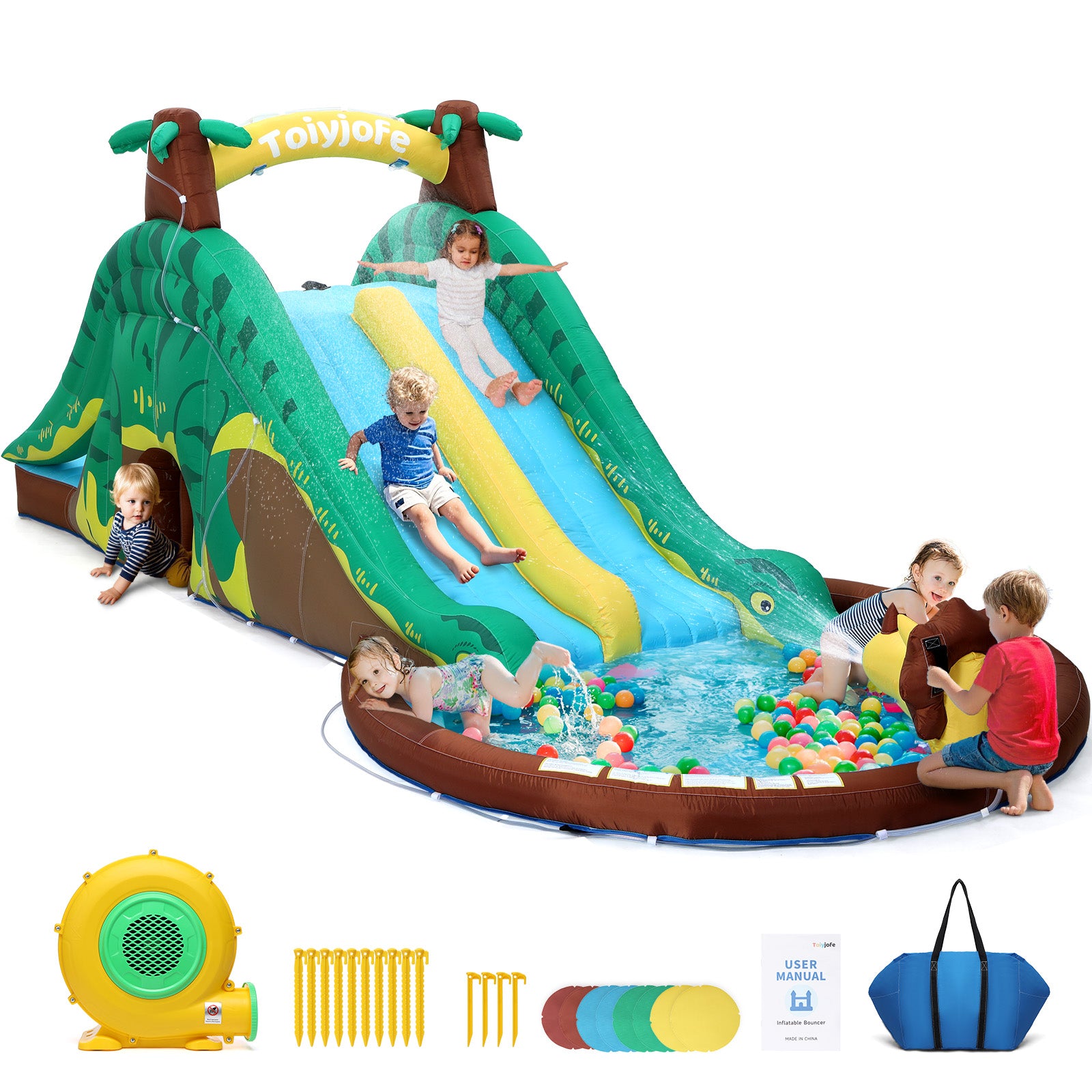 - Practical Accessories: The water slide bounce house includes a dinosaur inflatable water slide castle, a 480w blower, 10 ground stakes and 4 blower stakes to ensure the stability and sturdiness of the entire water park. Water pipe assembly kit with 3 velcro water spray nozzles for added fun, 10 patch sheets (2 pieces per color) for easy maintenance, and a carrying bag for easy storage and transportation. It can be used repeatedly, no need to spend extra money to take your children swimming outside.