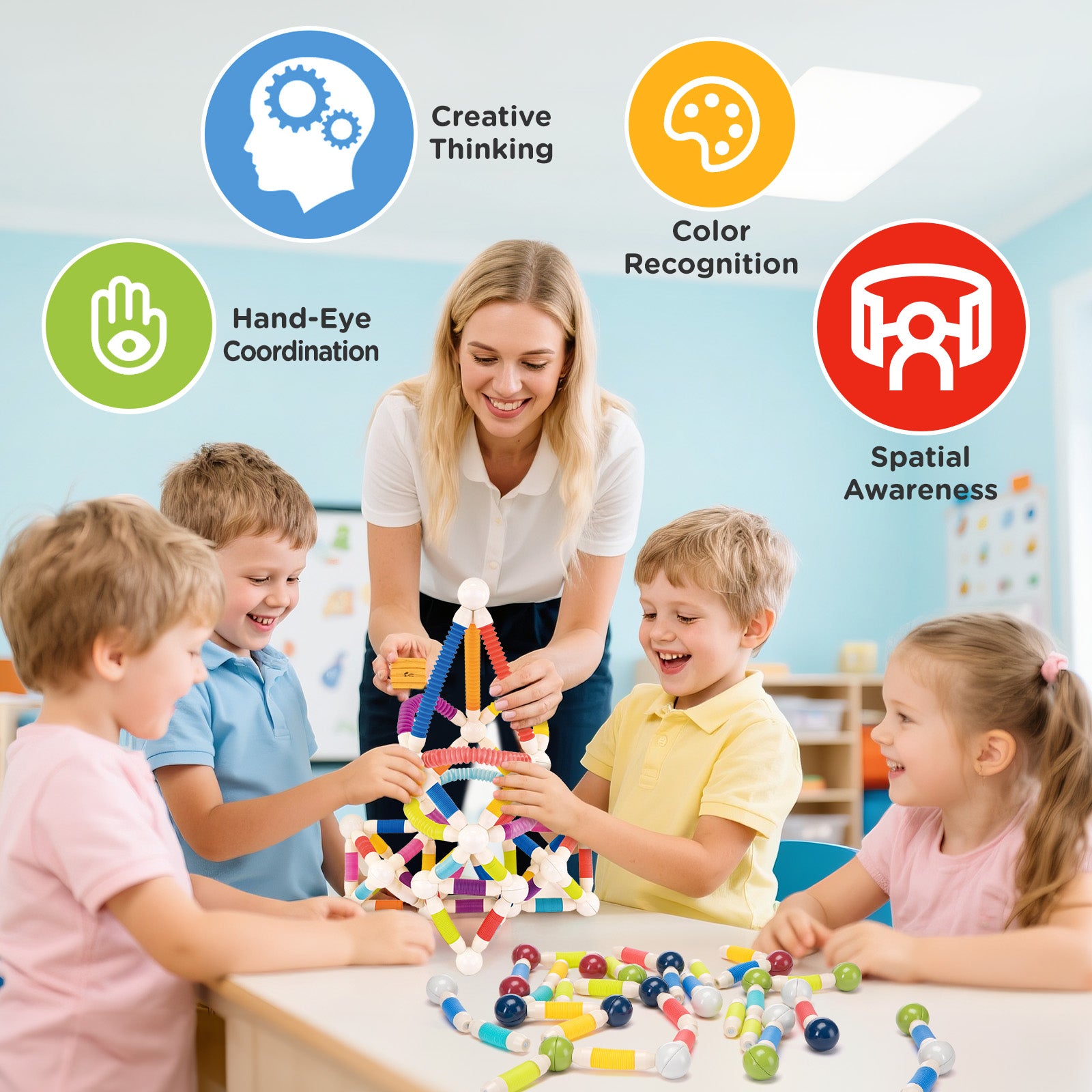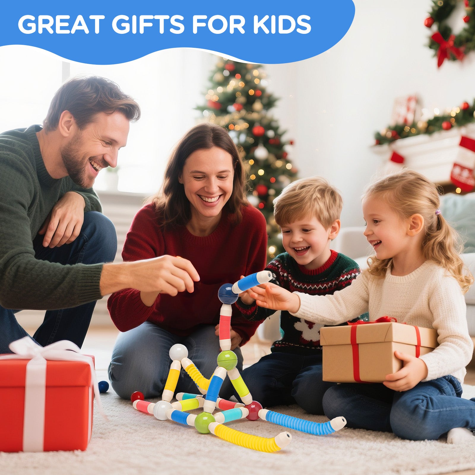 Flexible & Stretchable Design – Features bendable tubes that kids can pull, twist, and stretch — adding motion and tactile fun beyond standard magnetic blocks.